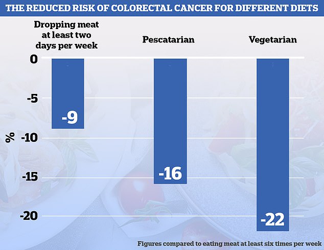 Onderzoekers van de Universiteit van Oxford ontdekten dat het beperken van de vleesinname tot vijf of minder dagen per week het risico op darmkanker met negen procent kan verminderen. Uit het onderzoek onder ruim 470.000 Britten over een periode van vijftien jaar bleek dat het risico nog verder daalde als mensen zouden overstappen op het eten van vis of helemaal zouden stoppen met vlees.