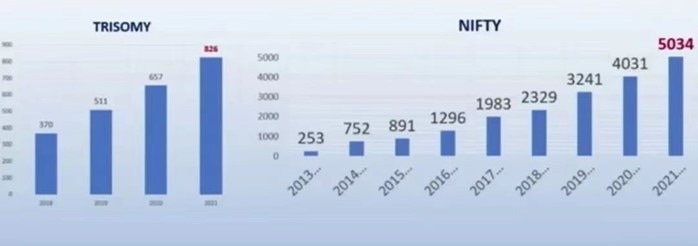 Sie bemerkte: „Wir hatten zwei Fälle mit positivem NIFTY für das Down-Syndrom. Um die Situation weiter einzuschätzen, führten wir eine Chorionzottenbiopsie (CVS) durch. Auch solche Tests zeigten die gleichen Ergebnisse. Dies ist sehr wichtig und zeigt die hohe Sensitivität des NIFTY Test Pro, da beide Fälle Plazentamosaik aufwiesen. Das bedeutet, dass NIFTY das Down-Syndrom erkennen kann, wenn die Plazenta normale Linien produziert, aber es kann auch den Fötus sehen.“