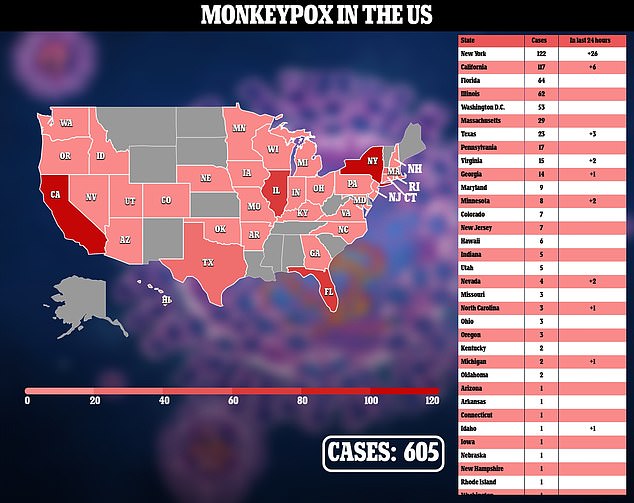 Amerika hat bisher 605 Fälle von Affenpocken registriert, die meisten davon in New York, Kalifornien und Florida. Es wurden keine Todesfälle gemeldet.